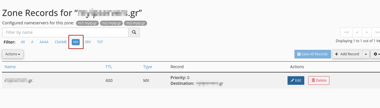 Επειδή σας ενδιαφέρουν μόνο τα MX Records, φιλτράρετε τον πίνακα να μας δείχνει μόνο αυτά: